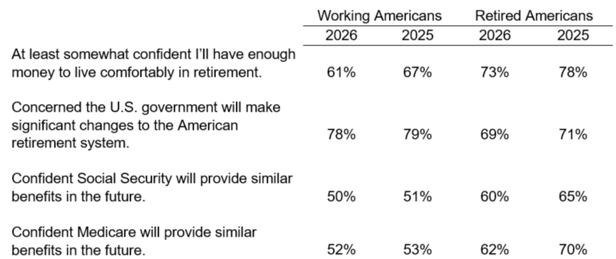 In 2026, American workers are less confident than they were in 2025 that they’ll have enough money to pay for basic expenses in retirement.Just 58 percent of workers and 71 percent of retirees are confident they will have enough money to keep up with inflation and cost of living in retirement. People who participated in the Retirement Confidence Survey were:
