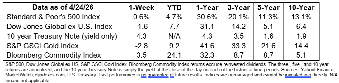 It’s still early in earnings season, which is the time when companies let investors know how they performed in the previous quarter. With 28 percent of S&P 500 companies reporting actual results so far, the index is on track to report its highest net profit margin (+13.4 percent) in more than 15 years. The Information Technology sector is leading the way with profits for the companies that have reported so far up 29.1 percent in the first quarter of 2026 compared to up 25.4 percent in the first quarter of last year, according to John Butters of FactSet.