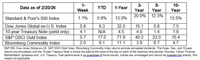 - Strong company performance continued. Overall, companies in the Standard & Poor’s 500 (S&P) Index did very well in the fourth quarter of 2025. The Index appears to be on track to deliver its fifth consecutive quarter of double-digit earnings growth. In mid-February, the Index’s blended year-over-year earnings growth rate was13.2 percent, reported John Butters of FactSet.